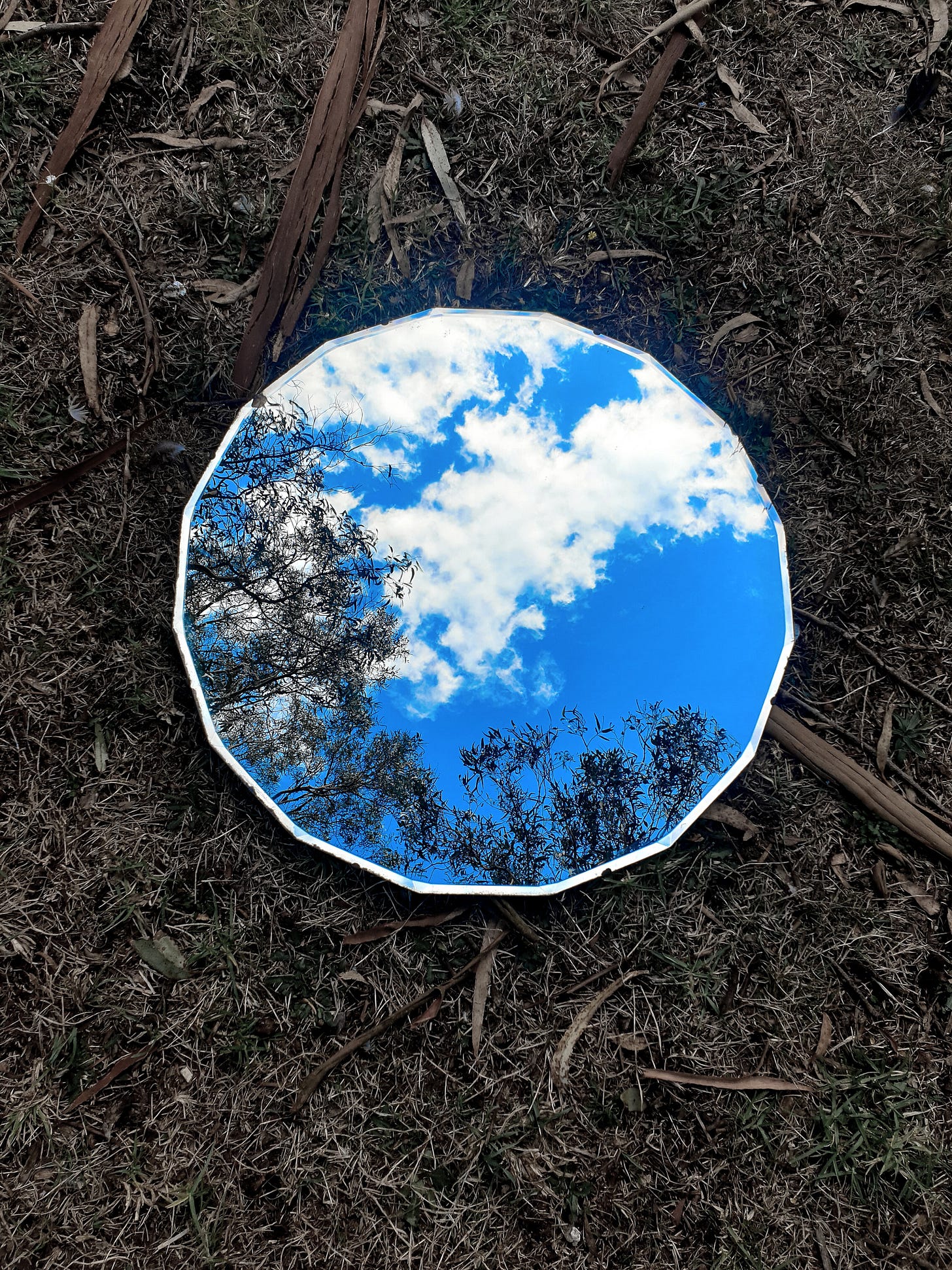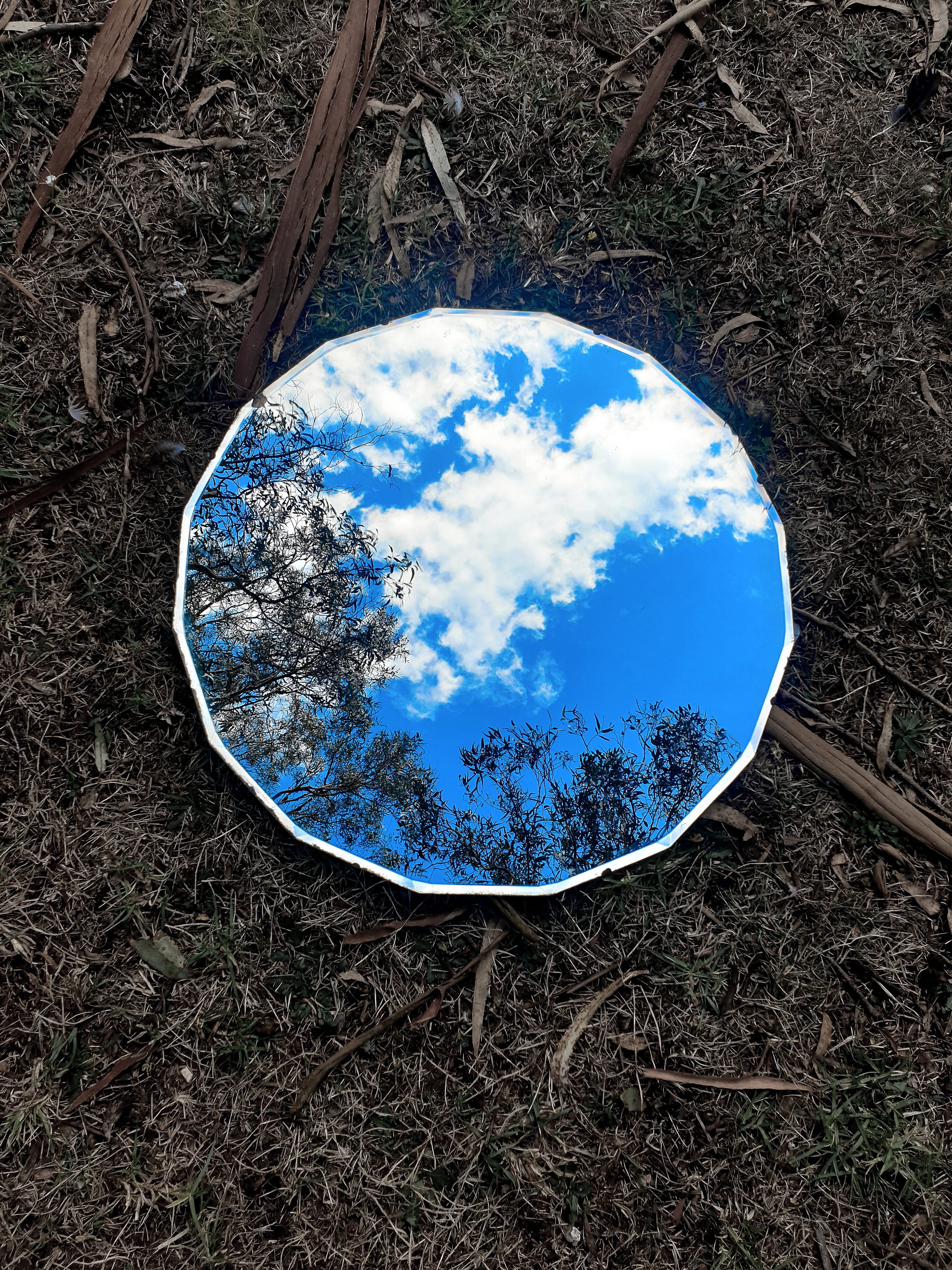 A mirror lay upon the ground reflecting sky, with grass around and as it captured all it saw, it whispered to her, wait there’s more… The moon, the sun, it didn’t care to show the world just what was there beyond what you’d expect to see, on grassy earth beneath the trees. And as she looked into it’s deep imaginings, she felt it creep into her soul and made her stay; to see her world a different way.